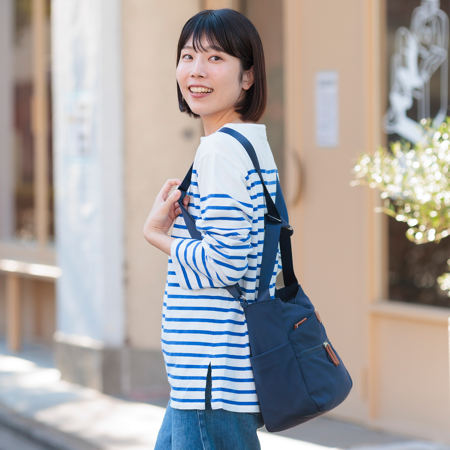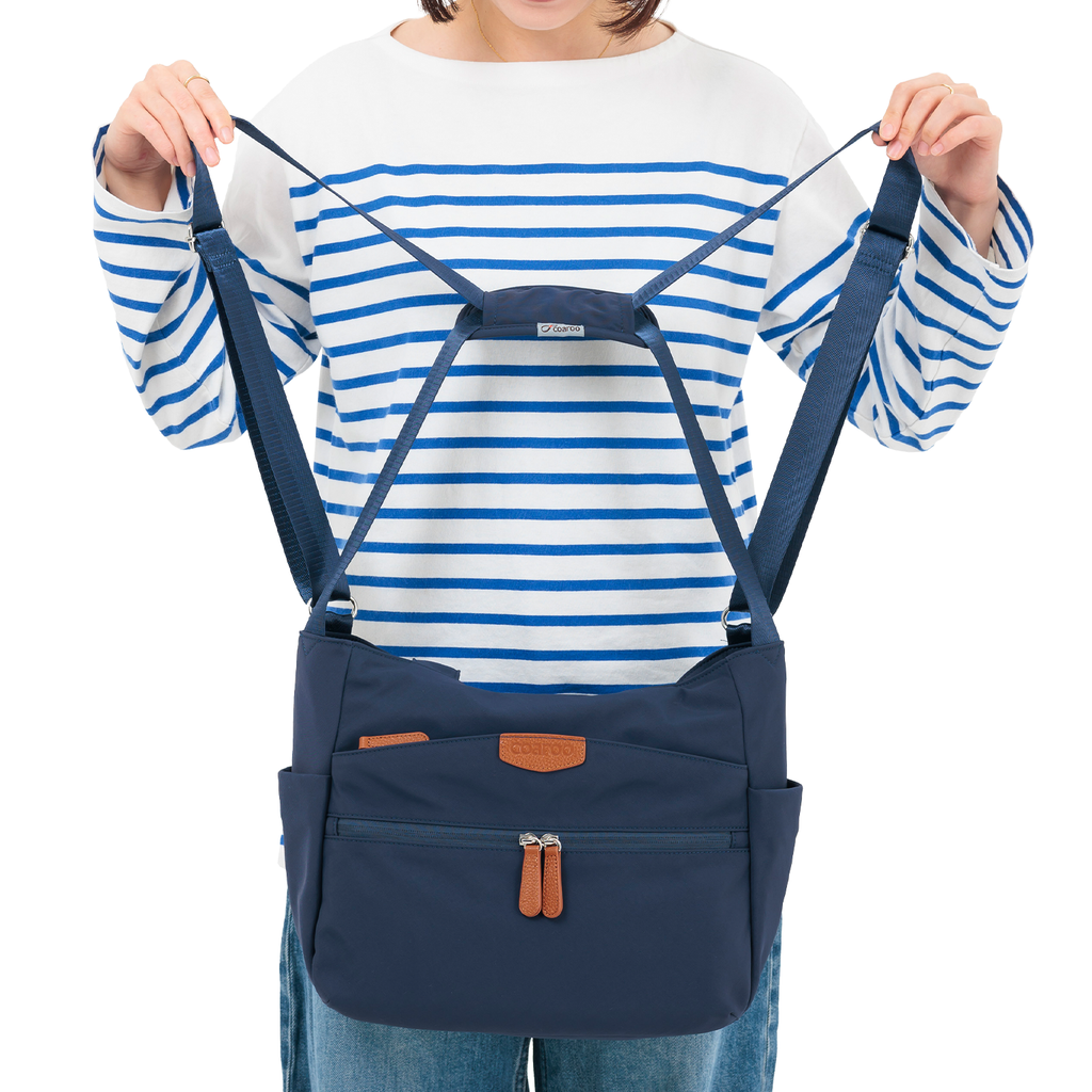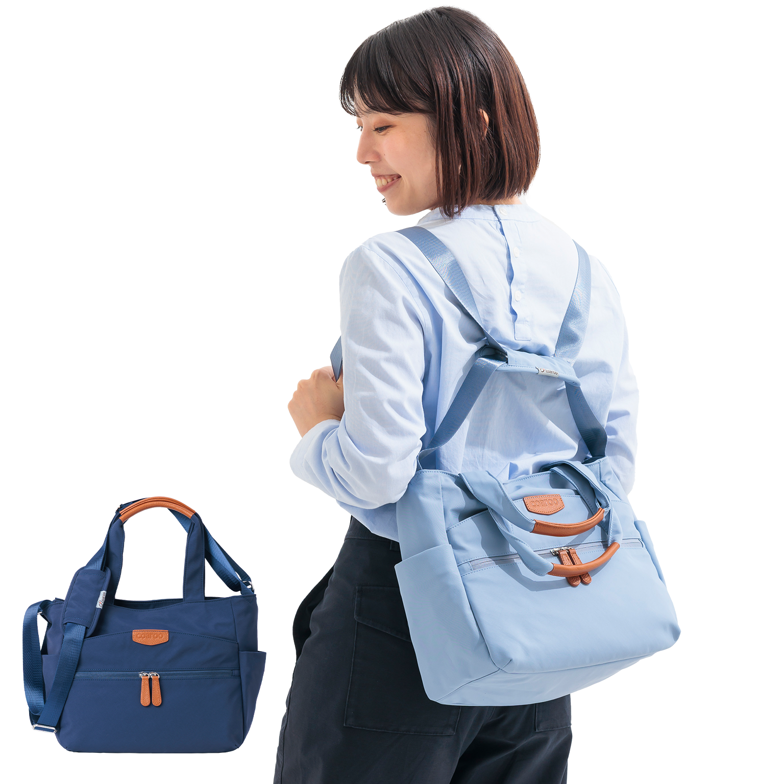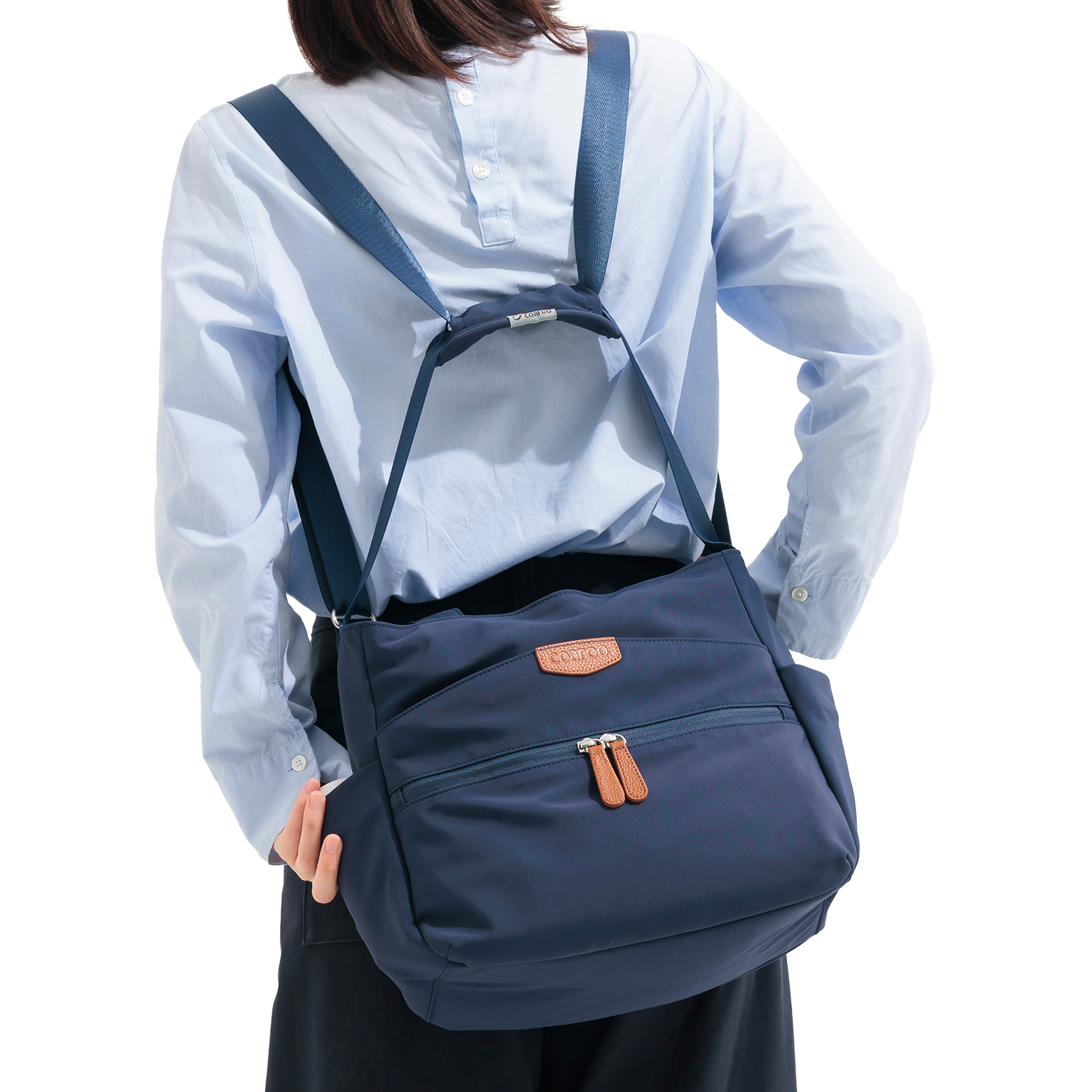 トートバッグから斜めがけ(肩掛け・ショルダー)、リュック、前抱え(前掛け・前バッグ)、メッセンジャーへと自由自在に変身し、シーンに合わせた使い方が可能。肩こりやなで肩、腰痛、足のケガ時にも負担の少ない掛け方ができるのもポイント。