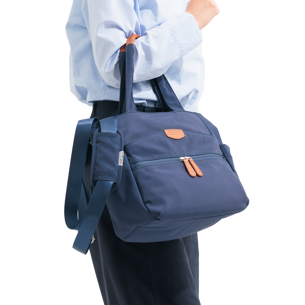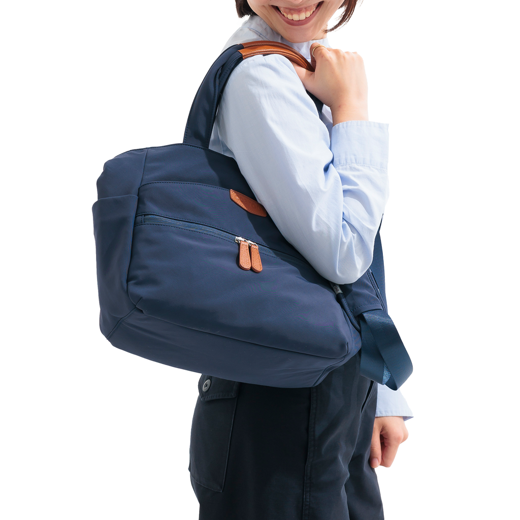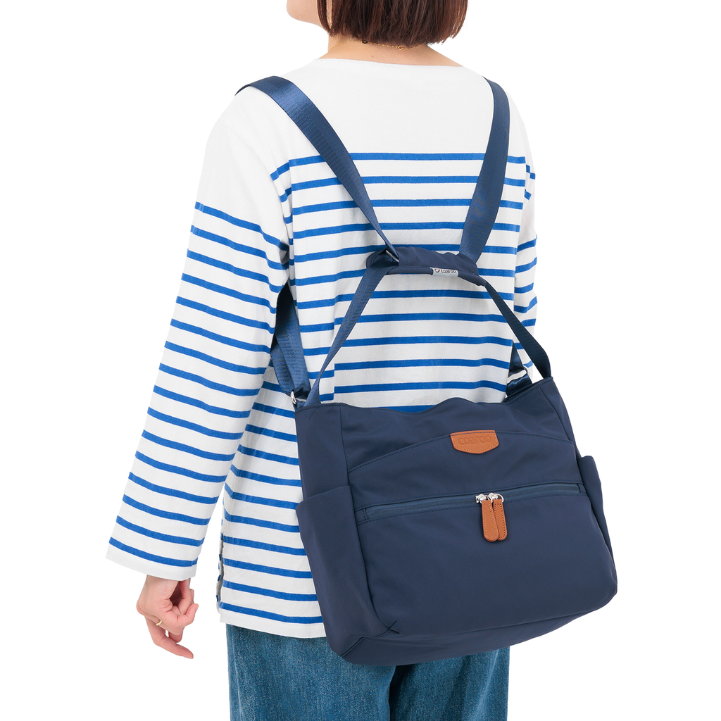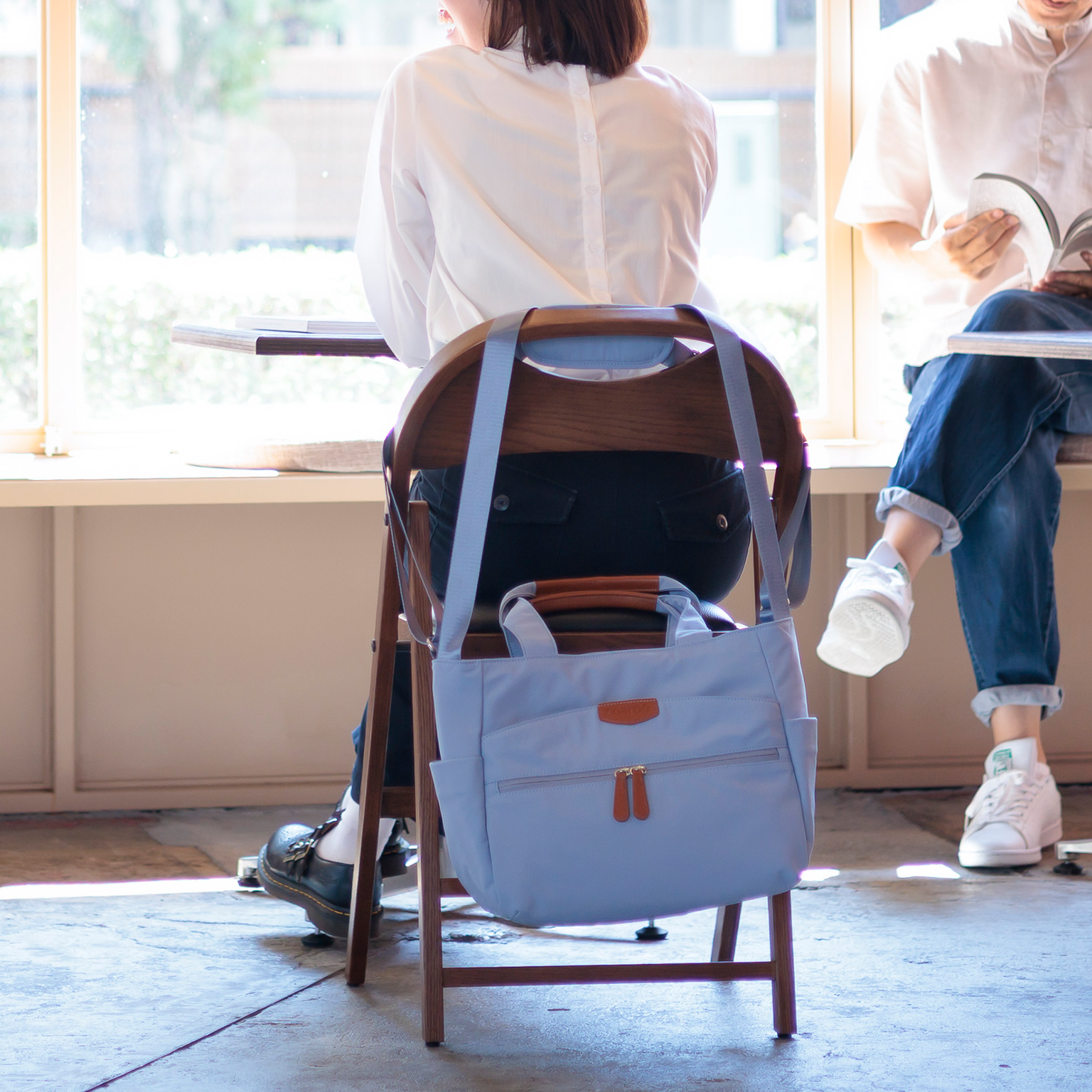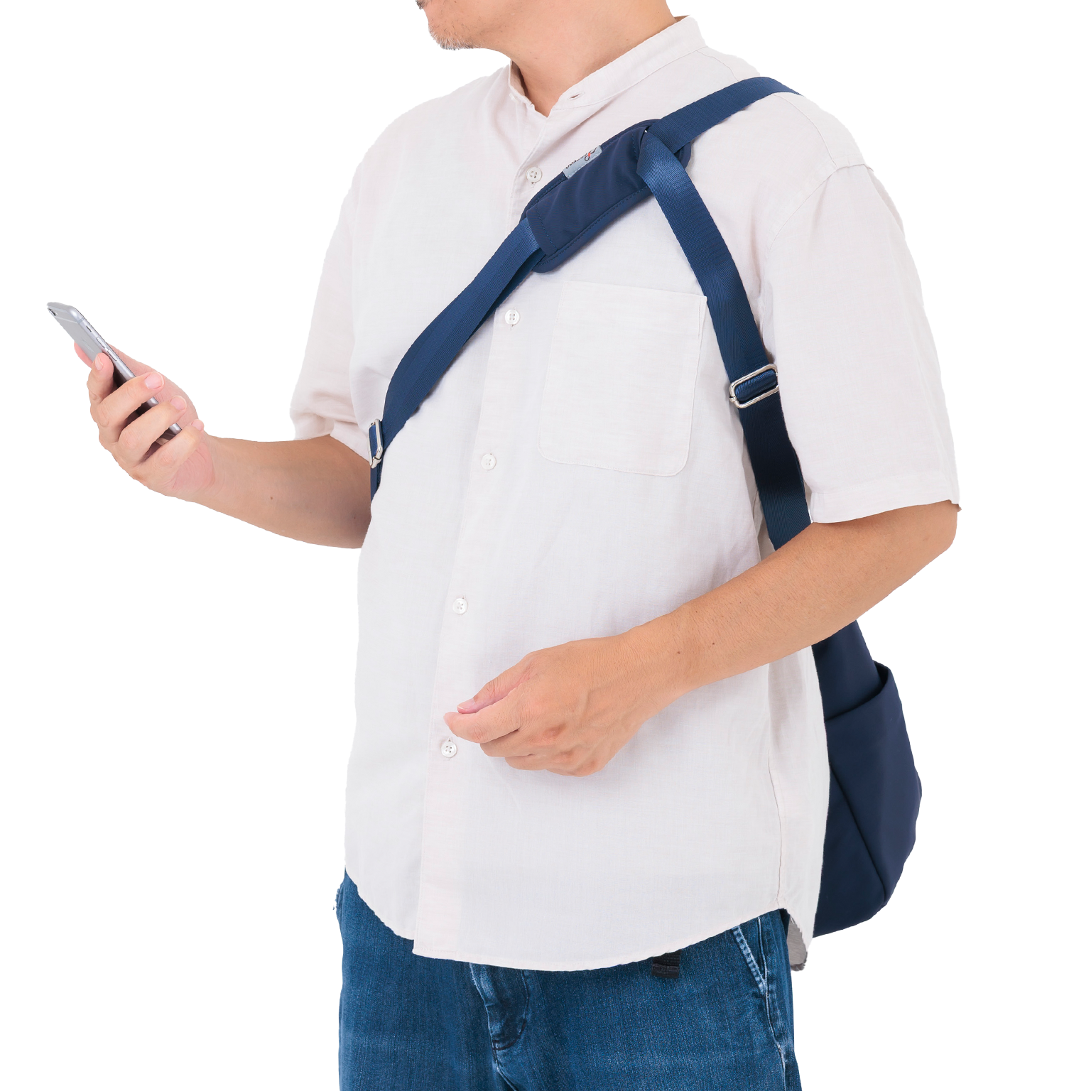 トートバッグから斜めがけ(肩掛け・ショルダー)、リュック、前抱え(前掛け・前バッグ)、メッセンジャーへと自由自在に変身し、シーンに合わせた使い方が可能。肩こりやなで肩、腰痛、足のケガ時にも負担の少ない掛け方ができるのもポイント。