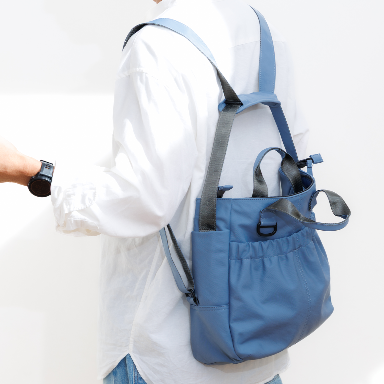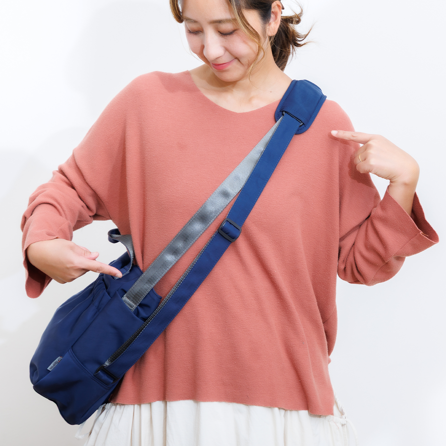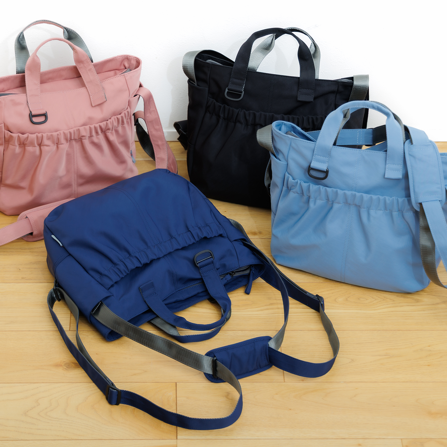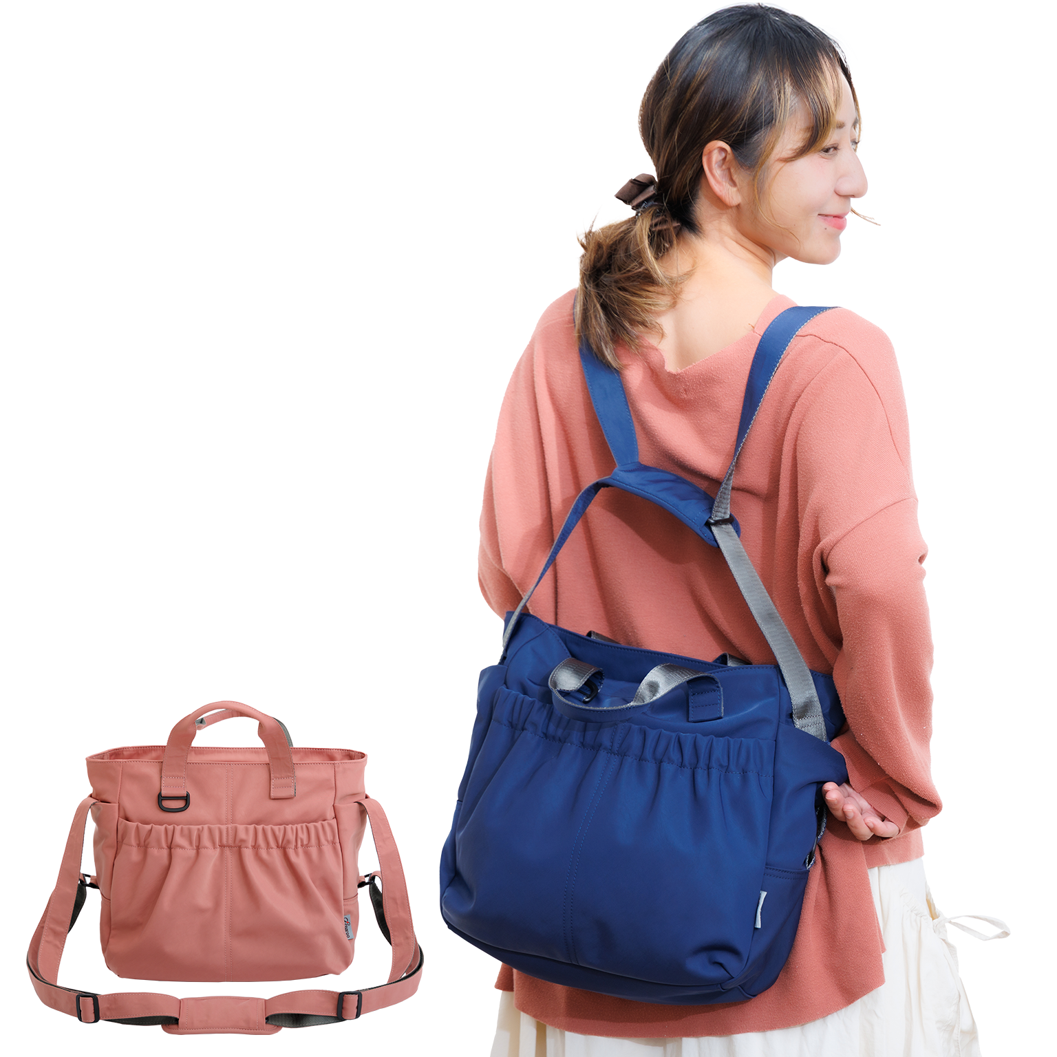 トートバッグから斜めがけ(肩掛け・ショルダー)、リュック、前抱え(前掛け・前バッグ)、メッセンジャーへと自由自在に変身し、シーンに合わせた使い方が可能。肩こりやなで肩、腰痛、足のケガ時にも負担の少ない掛け方ができるのもポイント。