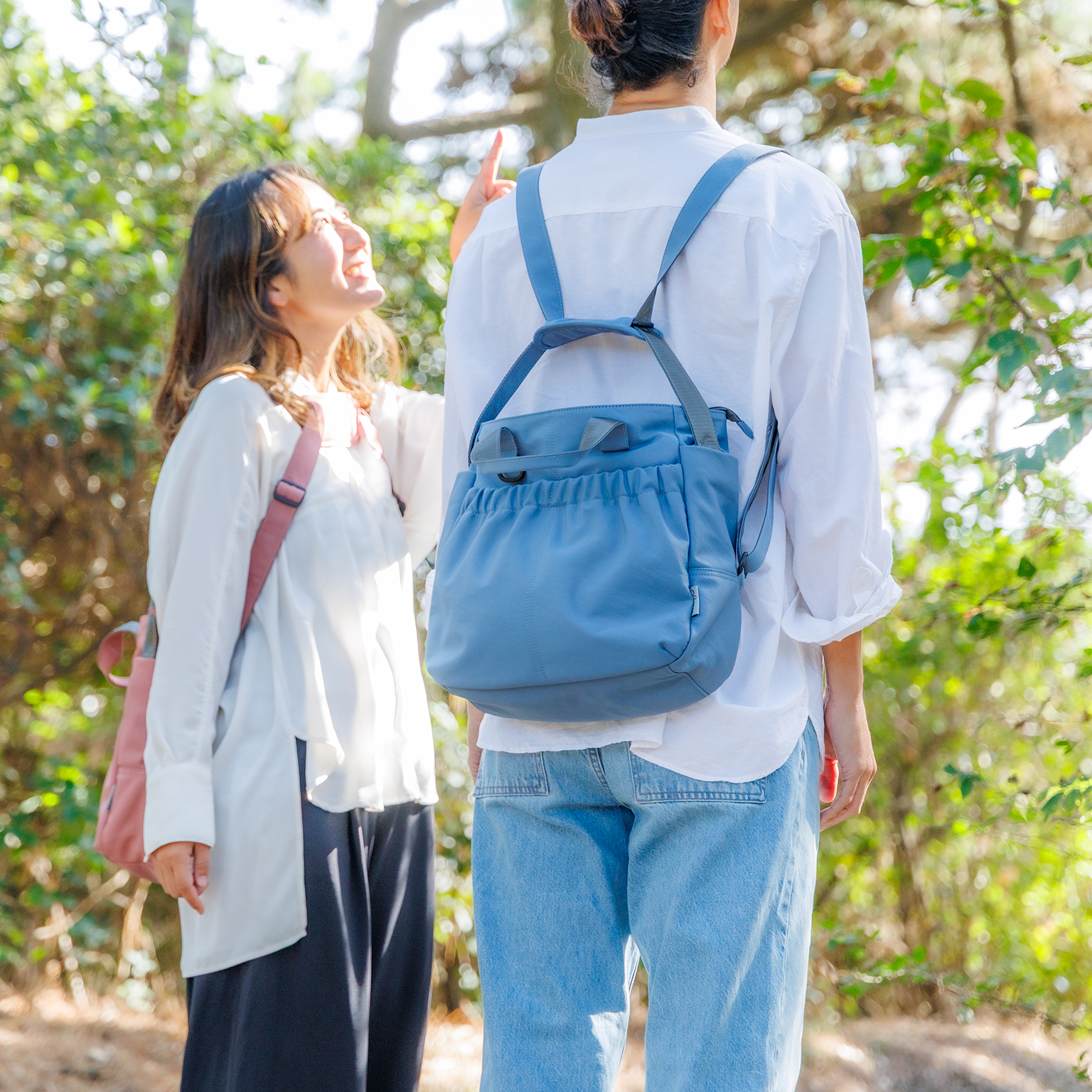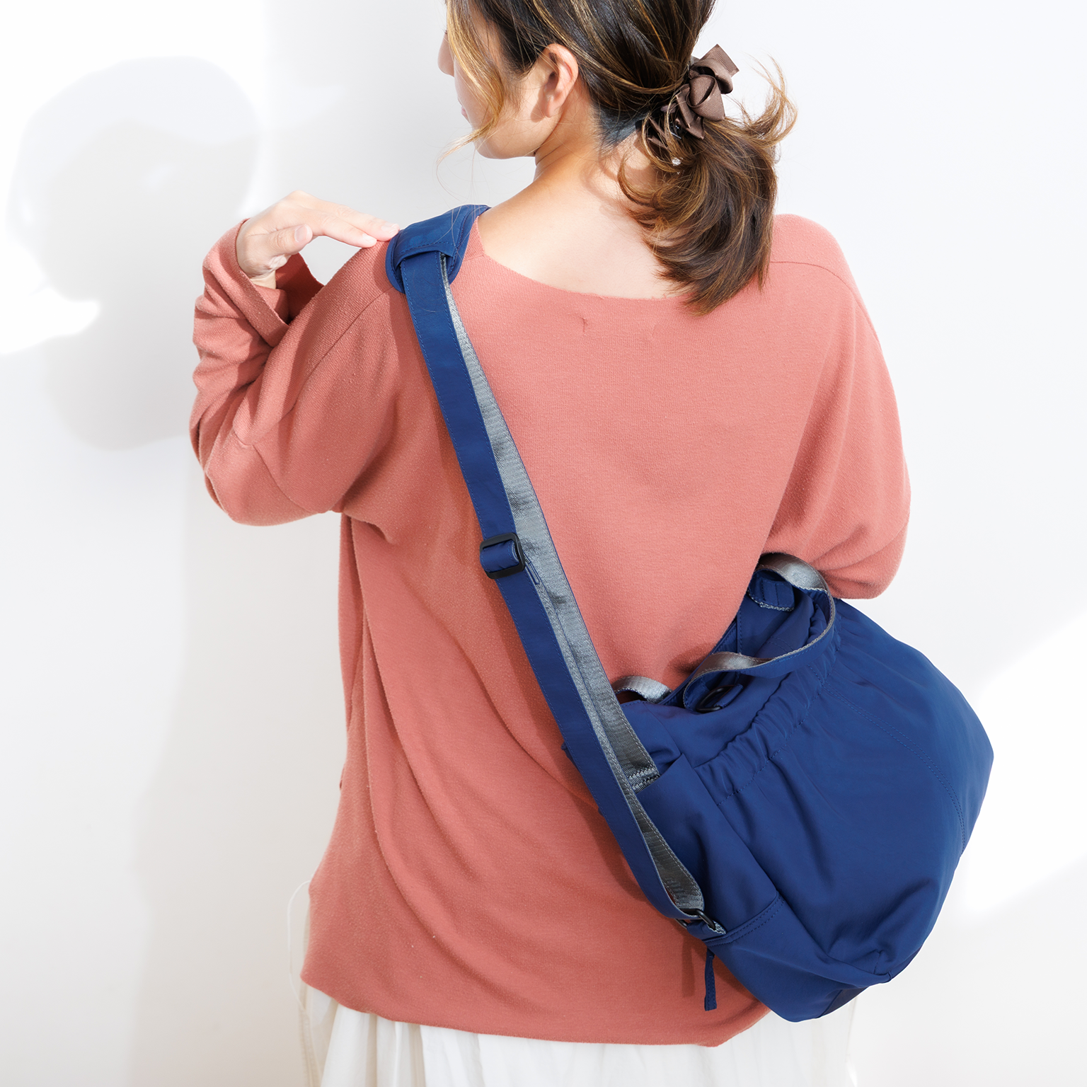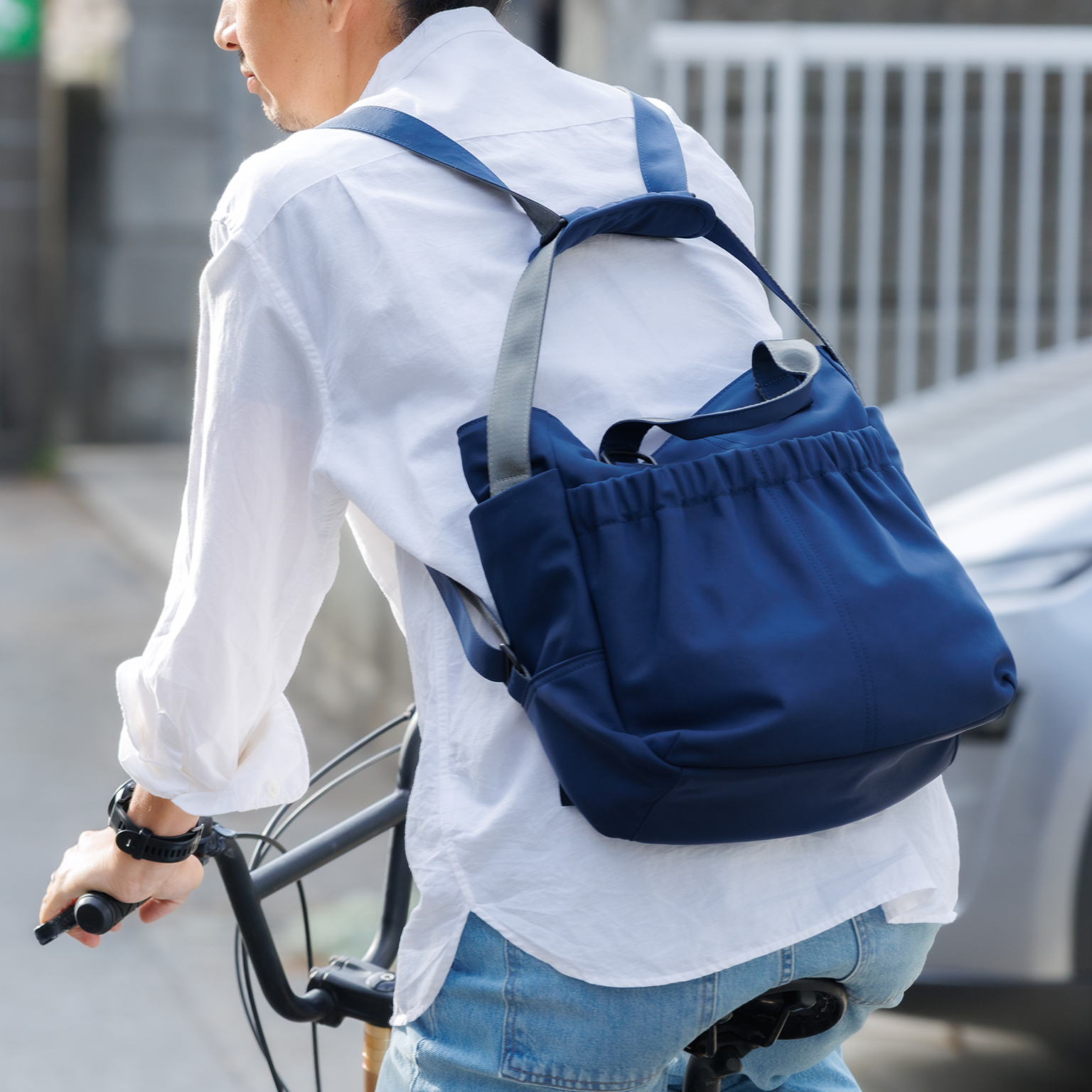 トートバッグから斜めがけ(肩掛け・ショルダー)、リュック、前抱え(前掛け・前バッグ)、メッセンジャーへと自由自在に変身し、シーンに合わせた使い方が可能。肩こりやなで肩、腰痛、足のケガ時にも負担の少ない掛け方ができるのもポイント。