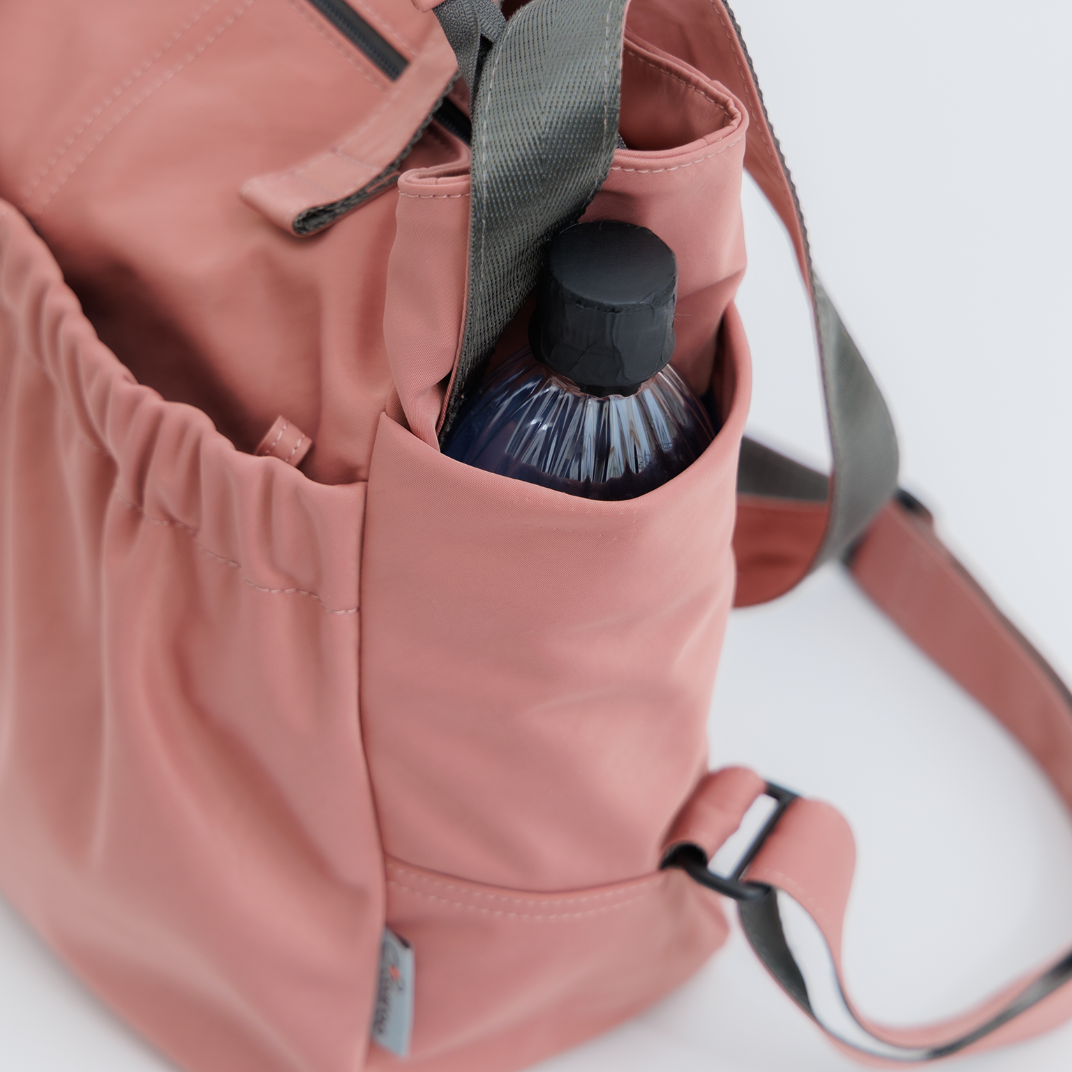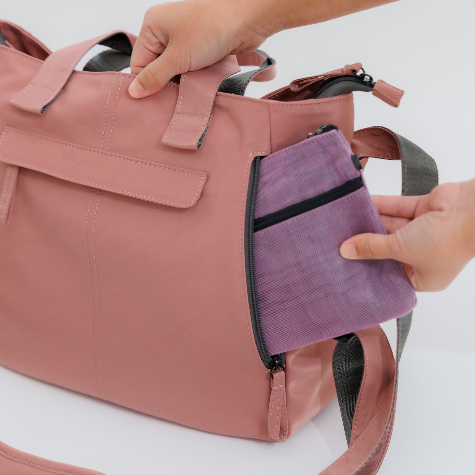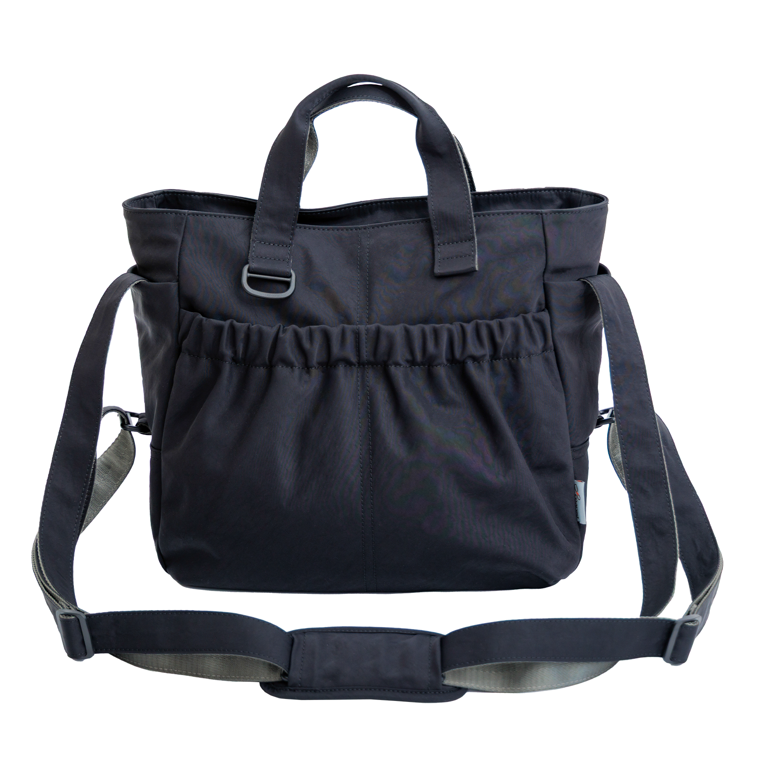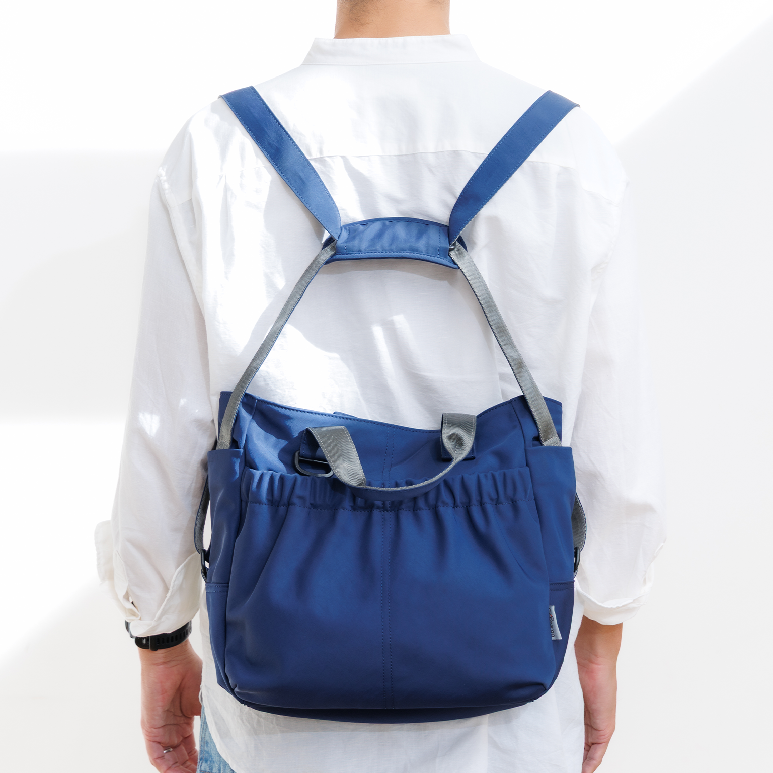 トートバッグから斜めがけ(肩掛け・ショルダー)、リュック、前抱え(前掛け・前バッグ)、メッセンジャーへと自由自在に変身し、シーンに合わせた使い方が可能。肩こりやなで肩、腰痛、足のケガ時にも負担の少ない掛け方ができるのもポイント。
